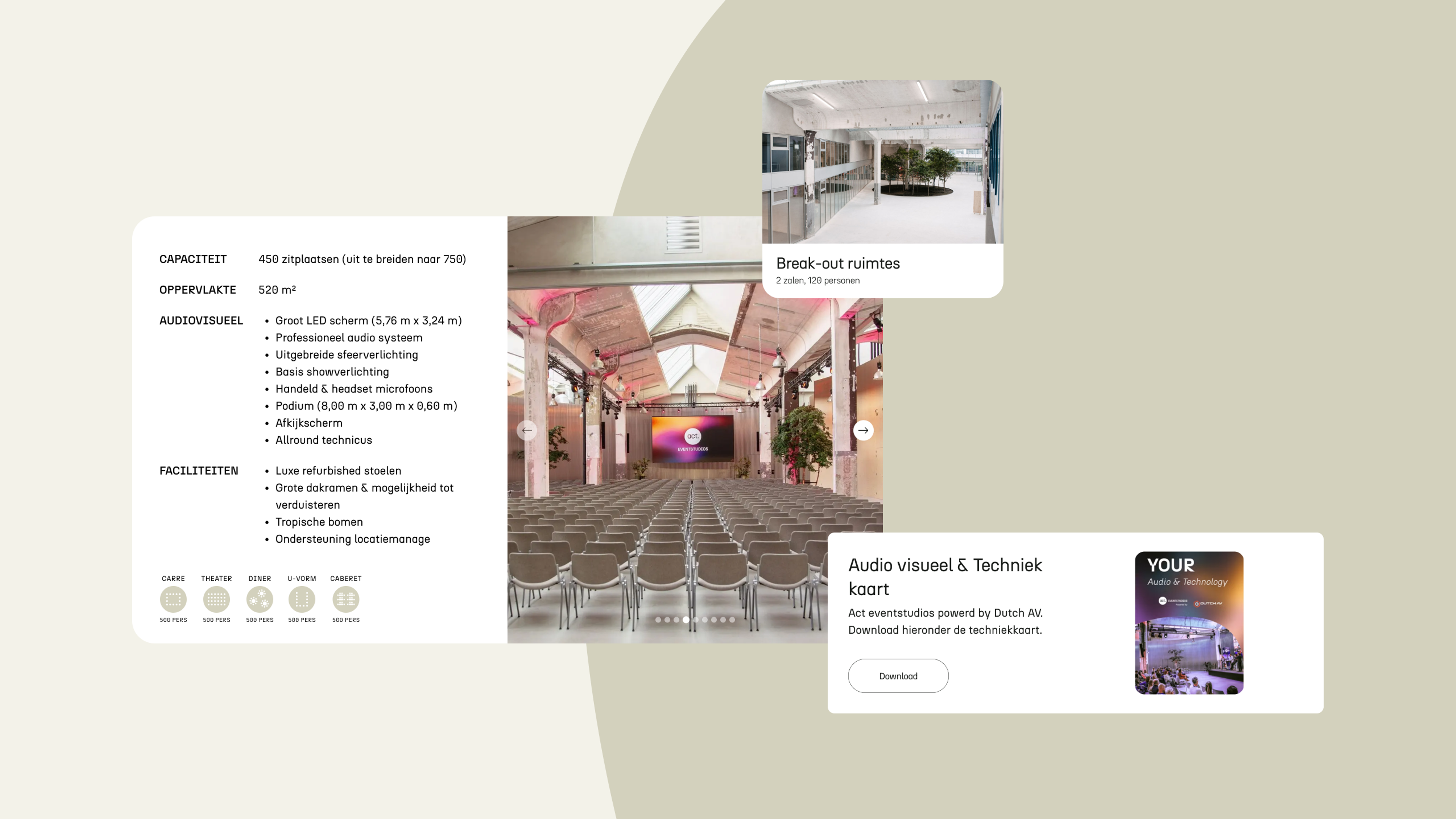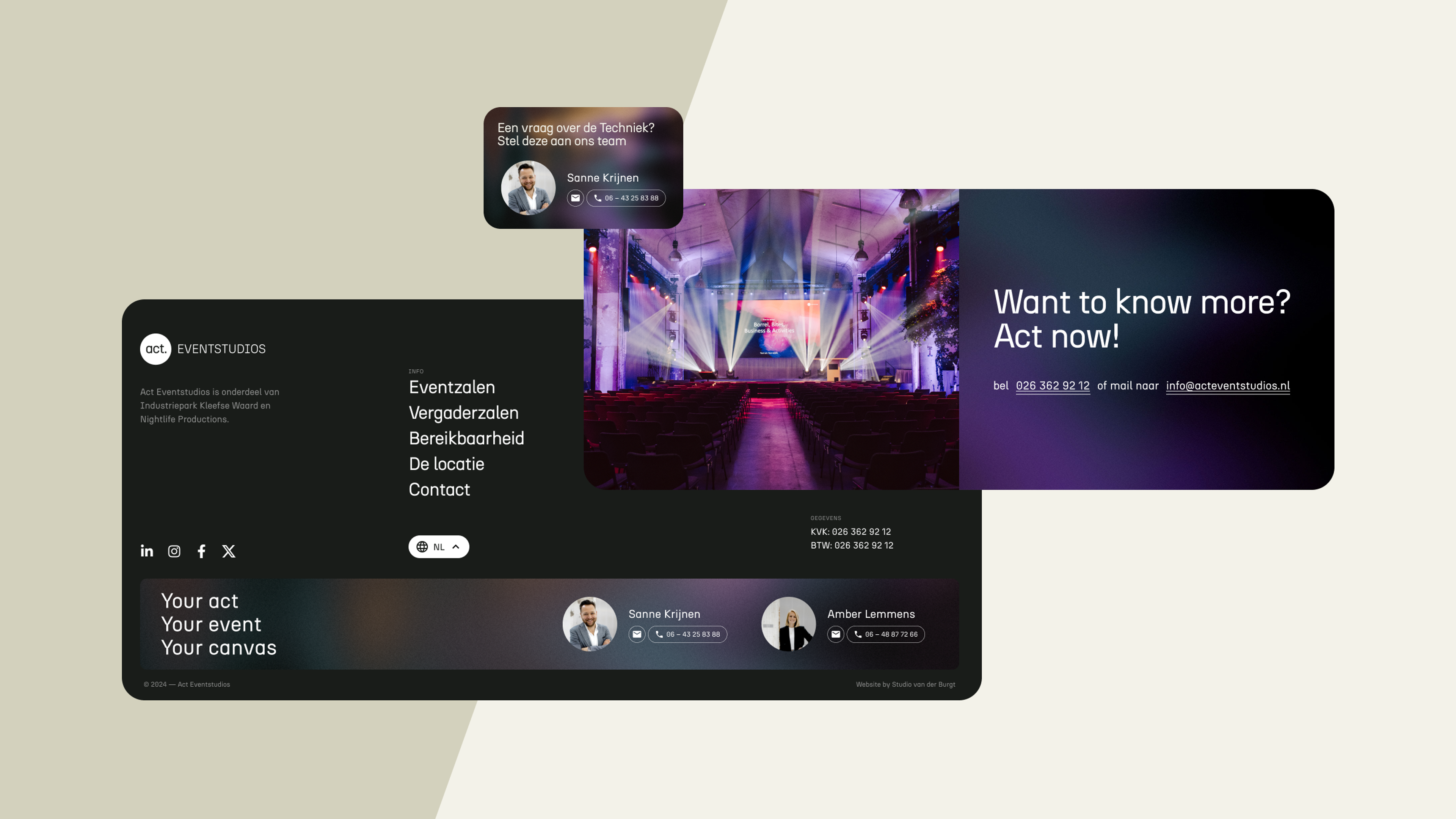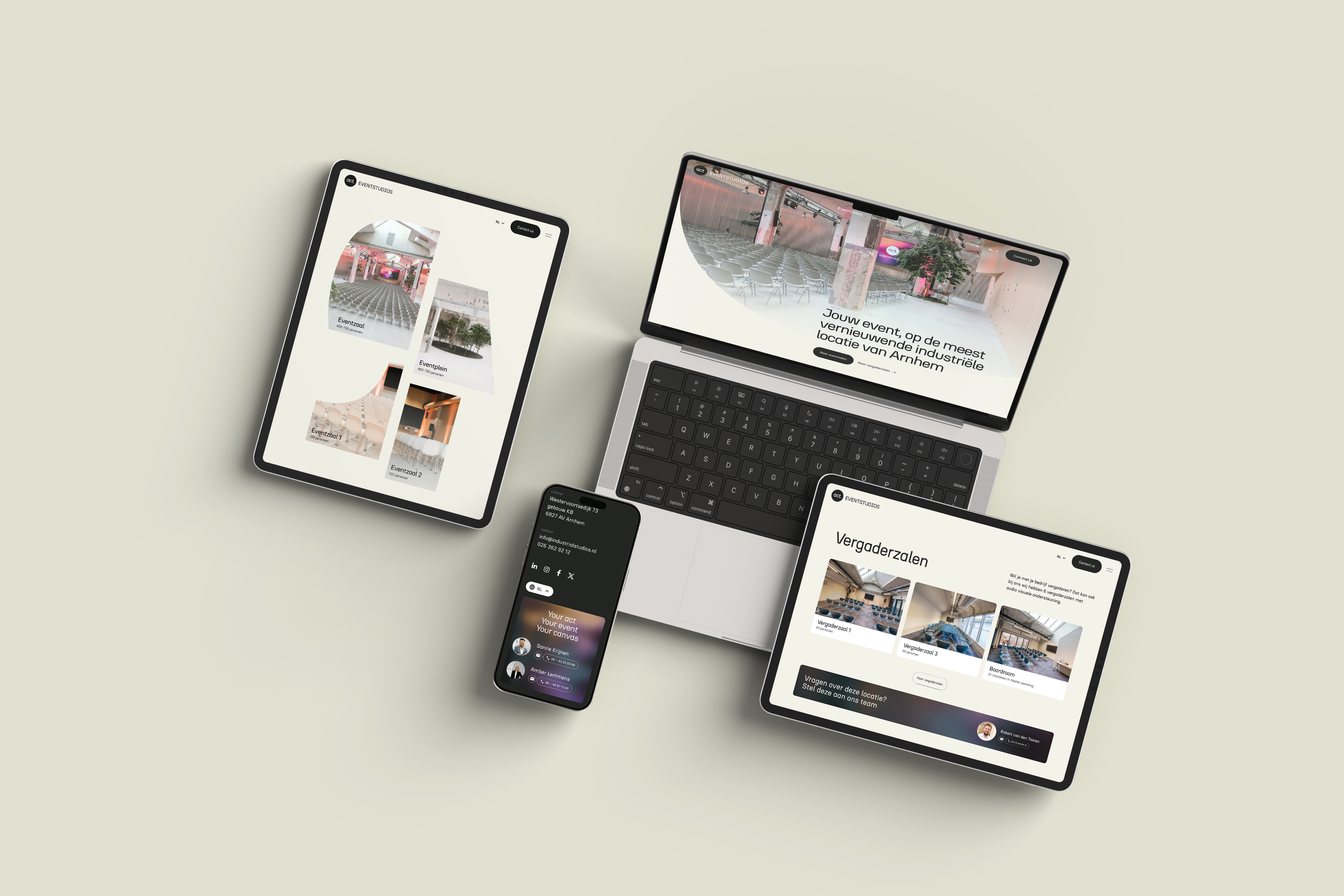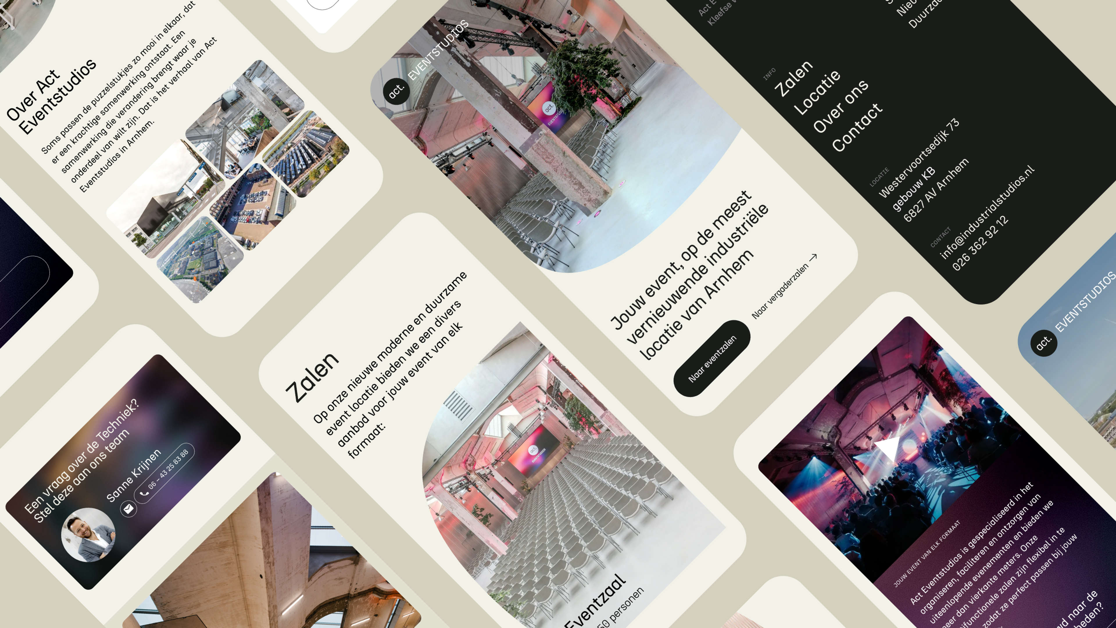 We designed and developed the Act Eventstudios website to reflect the venue’s unique blend of industrial character and sustainable innovation. The site combines clean layouts, bold shapes, and a refined color palette inspired by the architecture, creating a modern and inviting online presence. With a focus on clarity and user experience, we made it easy for visitors to explore the different event spaces, services, and sustainable features. Through thoughtful design and intuitive navigation, the website brings Act Eventstudios’ mission to life — as a place where connection, creativity, and change come together.
